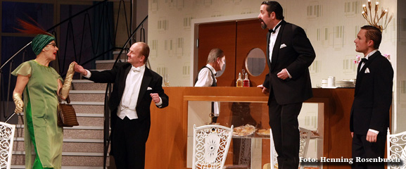 Doch zurück zur Inszenierung. Die Komödie gehört meines Erachtens zur Königsklasse und erfordert die besten Kräfte. Wie schön, wenn einem Regisseur ein geschlossenes Ensemble zur Verfügung steht und er aus dem Vollen schöpfen kann. Mit dem Hinweis „Hingehen“ könnte man nun schließen, aber man sollte doch das Ensemble doch etwas genauer unter die Lupe nehmen, doch wo beginnen. Nehmen wir das junge Liebespaar (denn ein Liebespaar gehört natürlich dazu). Lars Kopmann als Klapproths Neffe Alfred gibt den flotten 50ies Boy in der Marlon Brando Rockerjacke genauso überzeugend wie im Smoking bei der Abendgesellschaft. An seiner Seite Kathrin Molsberger als Frederike Schöller. Sie ist das selbstbewußte Mädchen aus der Großstadt, schön, gewandt und mit kessem Auftreten. Anja Lenßen ist die vielleicht für diese Rolle zu junge schöne Schwester von Klapproth, die Angst hat, im ländlichen Kyritz als Haushälterin ihres Bruders zu versauern. Ihr kluges Auftreten wird von ihrem Bruder unterbunden und sie fügt sich scheinbar seien Wünschen. Kabinettstücke