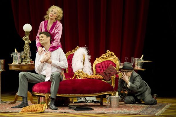 Bei Eisensteins wird gesoffen wie in amerikanischen TV-Serien der 60er Jahre. Leere und volle Flaschen, Champagner und Whisky sind Hauptdekoration des ersten Aktes. Ansonsten wenig roter Plüschsamt, der sich durch die ganze Inszenierung zieht. In Waut Koekens abonnentenfreundlicher Revue über Suff und Sünde wird kein Klischee ausgelassen.