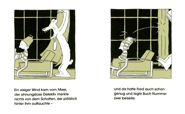Das erzeugt Lebendigkeit, aber die eigentliche Spannung erreicht Ole Könnecke mit einem genialen Trick. Er führt nämlich einen mageren, ausgehungerten weißen Bären ein (keinen Eisbären, der anders gebaut ist!), der Fred zu gern gefressen hätte, aber niemals zum Zuge kommt. Ja, er scheitert auf klägliche Art und Weise. Die besondere Komik besteht darin, daß Fred ihn gar nicht wahrnimmt und ihm unabsichtlich ständig Schaden zufügt.