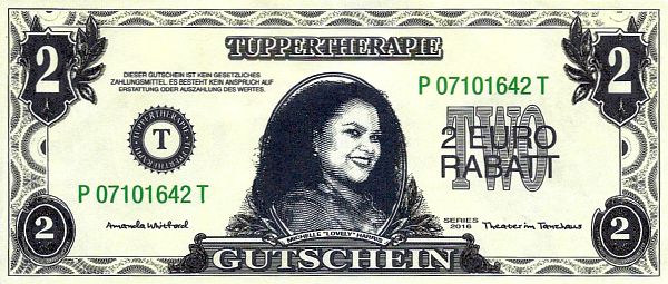 Nun gibt es aber auch positive Seiten: die sind zum einen in den zehn überwiegend von Damian Omansen komponierten und von Stephan Braun getexteten Songs zu finden, zum anderen in der Song-Performance von Teresa Schulz (die auch eine prima Jeannie in „Hair“ abgeben würde), Amanda Whitford (ein veritables Weather-Girl) und Angela H. Fischer. Frau Fischer gibt den Texten Tiefe, und sie ist auch jene im Ensemble, die ihrer Rolle den mit Abstand stärksten Charakter verleiht. Drücken wir dem Theater im Tanzhaus die Daumen, daß zumindest die Kasse stimmt, vielleicht ja auch durch die „unauffällige“ Produktplazierung für Vorwerk, REWE und natürlich Tupperware, „das Original“.