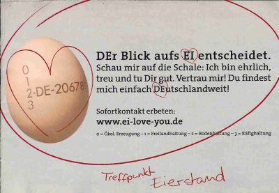Nun sind wir der Sache doch ein wenig tiefer auf den Grund gegangen und haben festgestellt, daß die Satire der Wirklichkeit aber auch rein gar nichts entgegenzusetzen hat. "Treffpunkt Eierstand" - eine wahrlich pikante Einladung zum Rendezvous. Wer mehr wissen möchte: www.eierhabensdrauf.de Ach ja: versäumen sie morgen nicht Teil 3. |