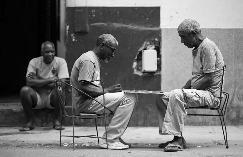 Und oft sind es ausdrucksstarke Menschen, deren Lebensspuren in ihren Gesichtern deutlich abzulesen sind, die Anna Schwartz dazu bewegen, den Auslöser ihrer Kamera zu drücken. Dabei ist der Kontrast zwischen Jung und Alt in ihren Arbeiten augenfällig. Die selbstvergessene Leichtigkeit kindlicher Daseinsfreude kontrastiert mit dem gelassenen Gleichmut des Alters und bilden so ein nuancenreiches Spektrum der Conditio Humana. Dabei richtet Anna Schwartz ihren Blick auch auf das Außergewöhnliche, das Abseitige. Die zurückgezogenen Menschen, die sich selbst nie in den Mittelpunkt stellen würden und die die am Rande stehen. Ihnen schenkt sie eine besondere Aufmerksamkeit, sie werden blitzschnell zu Stars vor ihrer Kamera. Daß die Ergebnisse manchmal auch ein Lächeln auf die Gesichter der Betrachter zaubern, bringt die emotionale Farbe in das monochrome Oeuvre. So etwa, wenn sich Erwachsene in Guatemala neben ihren Kindern in viel zu kleine Schulbänke drücken müssen oder entspannte Mühlespieler auf der Straße ihr Brett elegant auf den Oberschenkeln balancieren.