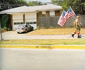 von Plätzen, Straßen und Gegenden mit deutlichen Zeichen der Verwahrlosung dramatisch die innere Leere ausdrückt. Wir sehen riesige Billboards in verwaisten, trostlosen Landschaften, die wie verzweifelt Botschaften transportieren: "Big Bang Theory - You´ve Got To Be Kidding - God" (eines von vielen Produkten der "Billboard Ministry"). Wir sehen einen jungen Mann, der zwar bereit ist, das Kreuz aufzunehmen, doch die wirkliche Last es zu tragen mit einem angeschraubten Rädchen vermeidet. Soviel zum Stichwort Bigotterie. Der Mythos von Alamo blättert ab, der Mythos um John F. Kennedys Tod aber lebt in Kritzelein und Graffitis an einem Bretterzaun in Dallas weiter. Andersons Molkerei sponsort eine Aufforderung der North Temple Baptist Church, sich nicht dem Begehren hinzugeben und allenthalben werden Star Spangled Banners herumgetragen wie hierzulande nur bei Fußballmeisterschaften. Wie verloren und sich offenbar nichts zu sagen habend erwarten zwei junge Frauen in einer leeren Sporthalle rechts und links von einer großen Plakatwand mit der Aufschrift "Welcome Home" vielleicht die Rückkehr ihrer Männer aus dem Krieg. Eher zufällig mahnt an anderer Stelle ein Parkaus-Hinweis "This is not an exit" und gleich daneben, ganz klein die Einsicht "One Way".