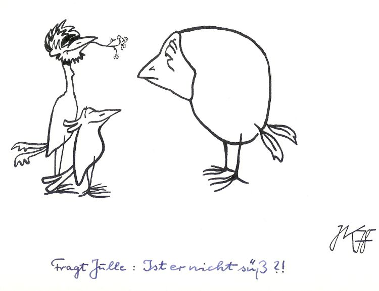 Einmal im Leben ist es soweit, daß die Tochter dem Vater den Mann ihres Herzens vorstellt und der Vater seine flügge gewordene Tochter einem jungen Burschen anvertrauen muß, der fortan die wichtigste Rolle in ihrem Leben spielen wird. Auch für Vatz ist heute dieser bedeutsame Tag gekommen. Wie vielen Vätern ist ihm dabei gar nicht wohl, scheint der Erwählte doch so gar nicht den väterlichen Vorstellungen zu entsprechen. Aber gemach - es sind noch immer aus junger Liebe die wundervollsten Ehen entstanden. Den beiden gehört von nun an die Welt - und eines Tages werden sie das alte Ehepaar sein, das aufmerksam hinschaut, wen Tochter oder Sohn nach Hause bringen. Wir verabschieden uns mit diesem Cartoon von Julle und Vatz, die uns fast ein Jahr lang jede Woche sonntags ein Lächeln geschenkt haben. Und wir danken dem Vater der beiden sympathischen Figuren, Joachim Klinger. Ihre Musenblätter-Redaktion |