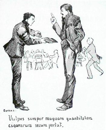 Während der Gast die Zigarre raucht, tritt er mit fragendem Lächeln, das Haupt auf und ab wiegend, vor den anderen hin, um ihm irgendeinen Ausruf unbeschränktesten Lobes zu entlocken. Dabei wedelt er noch mit der Hand etwas von der Dampfwolke an seine Nase. Wie alle Kunst, so hat auch unsere Kunst die ganz Unmöglichen aufzuweisen, die völlig unfähig sind, auch nur die Anfangsgründe zu erfassen. So einer ist der Wirt, der für seine Gäste je nach der Stellung, die sie im öffentlichen Leben bekleiden, feine und schlechte Zigarren hat. Auch das gibt´s! Nach dem Essen macht er die Runde um den Tisch, in jeder Hand trägt er ein Kistchen. In das eine läßt er die Bessergestellten, in die andere den kleinen Kaufmann, den Hauslehrer usw. greifen. In jener Kiste liegen die Rauchbaren, in der anderen diejenigen, die der Mensch nicht zu schauen und vor allem nicht zu rauchen begehren soll. Die paffende Gesellschaft ist also in zwei Hälften geteilt, man kann sagen: in zwei Zigarrenkisten. Für den Bevorzugten noch einen Rat: Er versäume ja nicht, die bunte Leibbinde der Zigarre sorgfältig zu vernichten. Es liegt der Gedanke nahe, daß der Wirt diese trügerischen Binden sammelt und sie für sein nächstes Borgiagastmahl um übelberüchtigte Zigarren legt, damit diese zweifelhaften Geschenke ein würdiges Aussehen bekommen.
