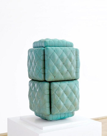 Craggs, beim Kunstverein Schwäbisch Hall, in der Stadtsparkasse Wuppertal und zuletzt in der Galerie Lüdenscheid zu sehen war. Sie formt banale Alltagsgegenstände ab, indem sie z.B. aufblasbare Formen (gerne Sitzpolster oder Matratzen) mit einem feinen Material überzieht und diese Oberfläche nach Trocknung schleift oder anderswie bearbeitet. Nur selten findet sie zu eigenen Formen im Raum wie „in flames“ (Polyurethan, Acrylfüller, Lack“). Diese Skulptur erinnert an die größere Skulptur „Upside down“, die nach der Ausstellung „Ebenda“ 2023 im Skulpturenpark Waldfrieden verblieb. Beim Neuerwerb („Double Box“) handelt es sich um zehn en Bloc zusammengestellte Polster, die in, grünlich patinierte Bronze gegossen, präsentiert werden. Das Hauptwerk des Saales besteht aus vier ebenfalls grünlichen Sofas und vier Matratzen, die zusammen in gespiegelter Position zusammen an der Wand hängen. Wie weit solche in dieser Ausstellung vor allem gezeigte Alltagsformen auf Dauer skulpturale Potenz und künstlerische Bedeutung entwickeln werden, bleibt abzuwarten. Immerhin sprach Roland Mönig von einem beachtlichen Tempo ihrer formalen Entwicklung in den letzten Jahren. Die goldene, wie mit einem Tuch umwickelte Skulptur „Swirl“ war auch im Skulpturenpark zu sehen, entfaltete dort bemerkenswerte Lichteffekte in der Sonne und Kontraste im Schnee.
