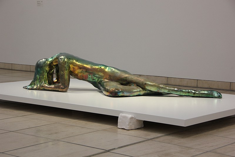 „Kulturspeicher“ versteht, und scheut damit nicht die Nähe zum Kunsthandwerk. Seine Keramik im 1. Raum fällt auf durch glänzende Glasuren, aufregend höckrige, unruhig strukturierte Oberflächen der Skulpturen, die mit Teufelsohren und maskenartig angedeuteten Gesichtern an groteske Fabel- oder Bühnenwesen erinnern. Keramikmasken mit Augen aus antiken Tonscherben schauen von den Wänden. Die Unwägbarkeiten, die beim Brand Veränderungen am Kunstwerk bewirken (Tropfen der Glasur, Bruch von Keramik u.a.) empfindet der Künstler nicht als Katastrophe, nicht als Fehler, sondern als Bereicherung der Ausdrucksmöglichkeiten (z.B. „Narziss“, oder „Gigant-Cadmium-Wesen (Fetisch) 2015“). Manche Figuren erinnern an schlanke, schlaksige Skulpturen von Wilhelm Lehmbruck (1881-1919). Seine Faszination für die Keramik begann, als er auf Lucio Fontana stieß, dessen keramische, unregelmäßige Kugeln mit ausgerissenen Oberflächenlöchern ihn stark beeindruckt haben. Eine davon aus der Sammlung des Museums hatte Karstieß für die Freundschaftsanfrage ausgewählt. Die Materialbearbeitung „unmittelbar mit Händen, Füßen“, das „Bewegen der zähen Masse durch einen Menschen“ das interessierte ihn.
