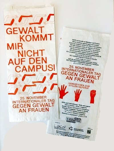 Seit dem 24. November machen eigens gestaltete Brötchentüten in den Cafeterien des Studierendenwerks auf die noch immer tabuisierte alltägliche Gewalt gegen Frauen aufmerksam. Die Tüten tragen Botschaften gegen Gewalt an Frauen sowie konkrete Hilfsangebote – mehrsprachig und niedrigschwellig.