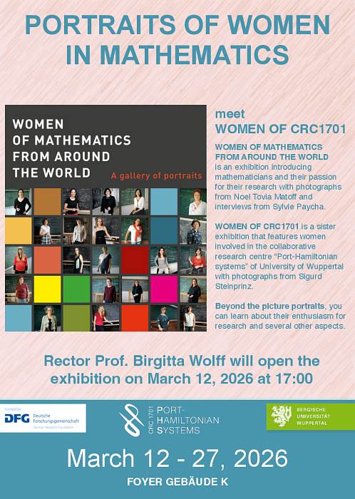 Ein weiterer Höhepunkt ist die am 12. März startende Begleitausstellung „Women in Mathematics“ („Frauen in der Mathematik“) auf dem Campus Grifflenberg (Gaußstraße 20) im Foyer von Gebäude K (Eröffnung 17 Uhr). Sie zeigt Mathematikerinnen aus der ganzen Welt und ihre Leidenschaft für ihre Forschung mit Fotografien von Noel Tovia Matoff und Interviews von Sylvie Paycha. An der Uni Wuppertal wird das internationale Porträt-Projekt um eine besondere Fotoarbeit erweitert: Vorgestellt werden dabei 13 Frauen, die gemeinsam im Sonderforschungsbereich „Port-Hamiltonian Systems“ forschen. Gezeigt werden Fotos von Sigurd Steinprinz. Daneben erfahren die Besucherinnen auch viel Persönliches über die Wissenschaftlerinnen: zum Beispiel, daß mathematische Probleme süchtig machen können, Zweifel normal und weibliche Vorbilder in der Mathematik wichtig sind. Zu sehen sind die Porträts bis zum 27. März.