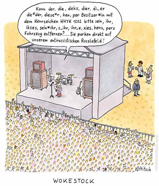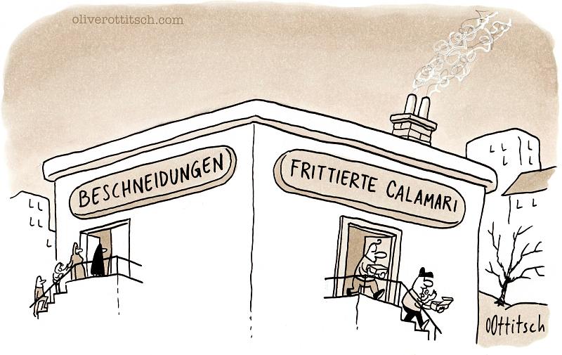 Ob es um Religion geht - suchen Sie sich eine aus, mit Kreuz, mit Bart, mit Bejkeles oder mit Turban -, ob um die politische Neuordnung in Mitteleuropa, um Sexualität in Variationen, um Kunst, Kultur, Knackwurst oder Klimawandel, Ottitsch hat die Antworten auf Fragen parat, die er mit scharfem Blick auf die momentanen Verhältnisse selber stellt. Daß unter den Hirse stampfenden Damen im Kral keine ist, die nicht beklagt, ihr Mann könne ihre Klitoris finden erklärt sich ebenso schlüssig wie die Ursache für Edvard Munchs „Der Schrei“ oder der tiefere Sinn hinter der Anschaffung einer Smartwatch. Wie wichtig der morgendliche Bürokaffee ist und woher Nike seinen Werbespruch hat, wie sich Architekturkritik äußern kann und wie man mit einem öffentlichen WC gleich zweimal verdient, sind nur ein paar der Beispiele aus Ottitschs satirischem Rundumschlag. Meisterliche Blasphemie und unfaire Schläge unter die Gürtellinie (wobei Burkas, Tschadors und Kaftane meines Wissens keine Gürtel haben) sind wie gezielte Geschmacklosigkeiten, um der Sache gerecht zu werden, eine Spezialität des kompromißlosen Chronisten mit dem Zeichenstift.