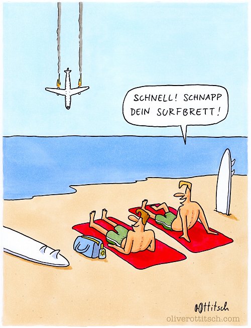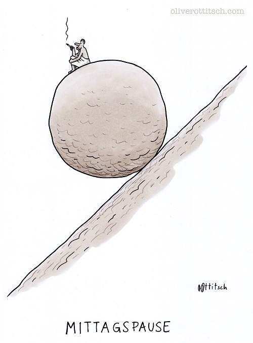 Für manche bitter, für die Mehrheit zum Vergnügen: „Smiley von hinten“ von Oliver Ottitsch. In unserer relativ spaßfreien Zeit sehr zu empfehlen, wobei die Mittagspause des Sisyphos, mein allerliebster Cartoon (ganz unten), unangefochten die Pole Position hält.