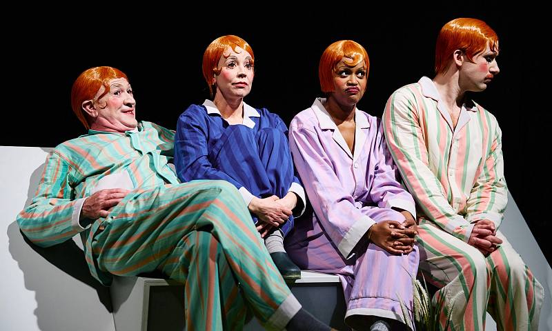 „Home sweet home“ entpuppt sich sogleich als ein auf deutsche Befindlichkeiten abgestimmtes Stück, die vier Personen treten zu den leicht moderierten Anfangsversen der Genesis im archetypischen Morgengewand des Deutschen auf, dem längsgestreiften Bademantel. Musikalisch habe ich hier ein wenig den Einspieler von Richard Strauss´ „Also sprach Zarathustra“ op. 30 vermißt. Aber musikalische Einlagen werden folgen und sind ein großer Spaß. Und daß man mit eifersüchtigem Blick und ausgefahrenem Staubwedel sein Revier mißtrauisch vor dem Zugereisten verteidigt scheint mir ebenfalls recht deutsch zu sein. Mit feinem Gespür für allseits bekannte Lebensszenen, Tischgespräche und das menschliche Miteinander hat Hannah Frauenrath textreich und originell ein Libretto zusammengestellt, das Leerformeln und Klischees mit Witz aufarbeitet, wobei die gelungene Artikulation ebenso wie die Körpersprache der Akteure auf der Bühne den Ausschlag gibt. Unisex in besagte Bademäntel und Schlafanzüge gekleidet, unisex mit roten Perücken angeglichen, bei denen allenfalls ein Löckchen oder Herrenwinker den Unterschied macht, dazu clownesk geschminkt bringen Silvia Munzón López, Stefan Walz, Celine Hambach und Konstantin Rickert diese kleine Klischee-Revue, die nach ca. 45 Minuten etwas schwächelt, dann aber wieder Fahrt aufnimmt, mit Humor und darstellerischer Kraft über die Zeit.