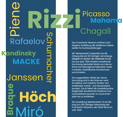 Die Ausstellung „Meisterwerke“ ist ein Beitrag zum 100. Geburtstag des Emschertal-Museums. Die ausgewählten Schätze der Herner Sammlung sind in thematischen Räumen zu Architektur und Industrie, Struktur und Stoff, Porträt- und Genremalerei sortiert. Damit bietet die Ausstellung eine Möglichkeit, Kunstwerke aus verschiedenen Epochen im Zusammenspiel neu zu entdecken.