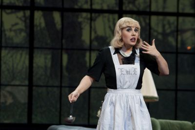 Auf der musikalischen Seite war allein durch die Besetzung schon ein schöner Abend garantiert. Bliebe die Frage, was macht der Regisseur aus dem Melodram? Andreas Baesler ist ja nicht für konventionelle Inszenierungen bekannt. So nahm er sich Donizettis Werk zur Brust, studierte genau Partitur und Libretto und schuf zusammen mit seiner Dramaturgin Judith Doderer eine überraschende Lösung. Das Elend, die Not und der Wahnsinn des Menschen werden in einer höchst vergnüglichen Version auf die Bühne gebracht. Die Liverpoolsche Einsiedelei mutiert in Harald Thors Bühnenbild zu einem gepflegten Landhaus im Stile des Film Noir der 40er Jahre. Geheimnisvolle dunkle Wände, Bärenfell, Winetable und Kamin zeigen ein gediegenes englisches Interieur, komplettiert durch einen Oldtimer mit Chauffeur. Die Kostüme von Gabriele Heimann unterstreichen das Dekor, werden aber durch slapstickartige Bewegungsabläufe der Bühnenfiguren konterkariert. Baeslers Ensemble besitzt die Bereitschaft, seinem teils groben, teils hintergründigen Humor Gestalt zu geben. Die perfekte Einstudierung einer fast barocken Körpergestik läßt auf intensive Probenarbeit schließen. Allen voran Rainer Zaun, der als düpierter Verlobter mit wunderbaren südhessischen Dialekt in die Figur Groucho Marx schlüpft. Unterstützung findet das Geschehen durch verfremdete Videoeinspielungen aus „ Keeper of the flame“( USA 1942, George Cukor) und „Captain Blood“ (USA, 1935, Michael Curtiz). Die neuinterpretierten Dialoge in deutscher Sprache werden von dem internationalen Ensemble in bemerkenswert verständlichen Klang und Deutlichkeit gebracht, sodaß auch dieser Teil des Abends zum reinsten Vergnügen wird.