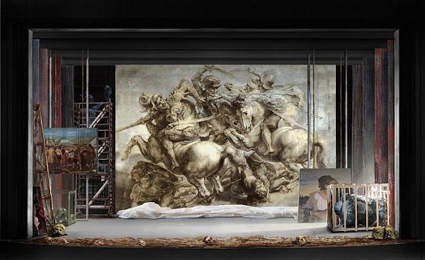 In seinem Konzept spielt das Stück in einem Museumsdepot – die Bühnenbilder stammen von Carlo Savi. Meisterwerke der bildenden Kunst sind in diesem Depot „getrennt von den Augen der Welt“ und betreut von einigen wenigen Statisten, offenbar Restauratoren.