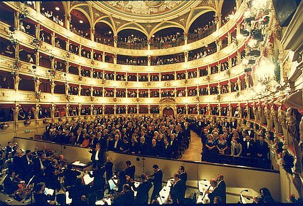 Es ist ein prachtvolles Gebäude, errichtet von dem Italiener Gian Antonio Selva (von ihm stammt auch das La Fenice in Venedig) und dem deutschen Matthäus Pertsch (der maßgeblich Triests Stadtbild im 19.Jahrhundert mit einer Reihe von Gebäuden mitgestaltete). Es zählt mit seiner an der Mailänder Scala orientierten Fassade zu den schönsten klassizistischen Bauten Triests. Das Haus wurde 1801 mit „Ginevra di Scozia“ des bayrischen Komponisten Johann Simon Mayr eröffnet und hat rund 1400 Plätze in fünf Rängen. Und natürlich sind das Haus und sein Repertoire ein Spiegel der Geschichte Triests. Von 1382 bis 1918 gehörte Triest zum österreichischen Habsburgerreich – es ist eine Stadt im „Grenzbereich der Kulturen“, wie es der Triestiner Claudio Magris einmal ausgedrückt hat. Das findet auch seinen Niederschlag auf der Homepage des heutigen Teatro Verdi, wo es über die Geschichte des Hauses heißt: „Das Theater wurde zum Symbol der italienischen Kultur dieser Stadt, indem es die italienische Musikkultur in die benachbarten deutschen und slawischen Gebiete ausstrahlte, aber gleichzeitig Interpret des kosmopolitischen Triests blieb und dem Publikum die Werke der mitteleuropäischen Komponisten vermittelte.“