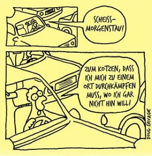 Aber wenn wir genau hinschauen, stellt sich ganz schnell heraus, daß es überhaupt keine hühnerverachtenden Späße sind, denn Savage meint mit seinen One-Pagern alle, die sich Tag für Tag früh am Morgen ins Büro schleppen, die Zeit vor dem Bildschirm absitzen, sich wieder nach Hause schleppen, vor dem eigenen Bildschirm und dem Fernseher abhängen, ins Bett gehen… und das, bis der Tod eintritt. Savages Cartoons haben im Internet – die Seite ist unten angegeben – mächtig viel Erfolg bei allen Bürogeschädigten, Hühnern wie Hähnen. Im Antje Kunstmann Verlag ist soeben zum ersten Mal in deutscher Sprache ein - trotz einiger eigenwilliger Übersetzungen - wundervolles Bändchen mit einer köstlichen Auswahl der bisher