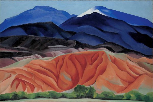 Daß sich Georgia O’Keeffes Œuvre keineswegs auf den gerade angesprochenen Aspekt verkürzen läßt, zeigen eigenwillige Ansichten New Yorker Hochhausbauten ebenso wie die großartigen Landschaftsbilder aus New Mexico, jener Region der USA, die sie erstmals 1917 besucht und deren herbe landschaftliche Schönheit sie zeitlebens fasziniert und künstlerisch inspiriert hat. Seit 1929 hielt sie sich in unregelmäßigen Abständen immer wieder in New Mecixo auf, um nach dem Tod von Stieglitz 1946 in den späten 1940er Jahren endgültig im Südwesten der USA ansässig zu werden. In der Abgeschiedenheit ihres Hauses in Abiquiú (etwa 85 km von Santa Fe) und auf langen Wanderungen erschloß sie sich die bizarren Bergformationen und die menschenfeindliche Wüstenlandschaft ihrer Wahlheimat und transformierte diese Eindrücke in unverwechselbare Gemälde von großer Eindringlichkeit. Dabei begegnete sie auf Schritt und Tritt auch der Vergänglichkeit und schuf ihre ureigenen Versionen eines kunstgeschichtlich traditionsreichen Motivs, nämlich des „memento mori“, indem sie Bilder malte, die in streng symmetrischer Anordnung schlanke Pferdeschädel – Fundstücke auf ihren Streifzügen durch die Umgebung – zeigen. Mit zunehmendem Alter wurden O’Keeffes Gemälde immer reduzierter. So wurde für sie eine schlichte, schwarze Tür im Patio ihres Adobe-Hauses zu einem Motiv, das sie merfach abwandelte und bis zur fast vollständigen Abstraktion durchvariierte – etwa in dem Bild „Meine letzte Tür“ von 1952/54, in dem Räumlichkeit und Perspektive zugunsten einer reinen Flächigkeit verschwunden sind. Ganz offensichtlich kehrte die Künstlerin hier zu ihren abstrakten Anfängen zurück, freilich bereichert und geläutert durch die schöpferischen Erfahrungen eines langen und produktiven Künstlerlebens.