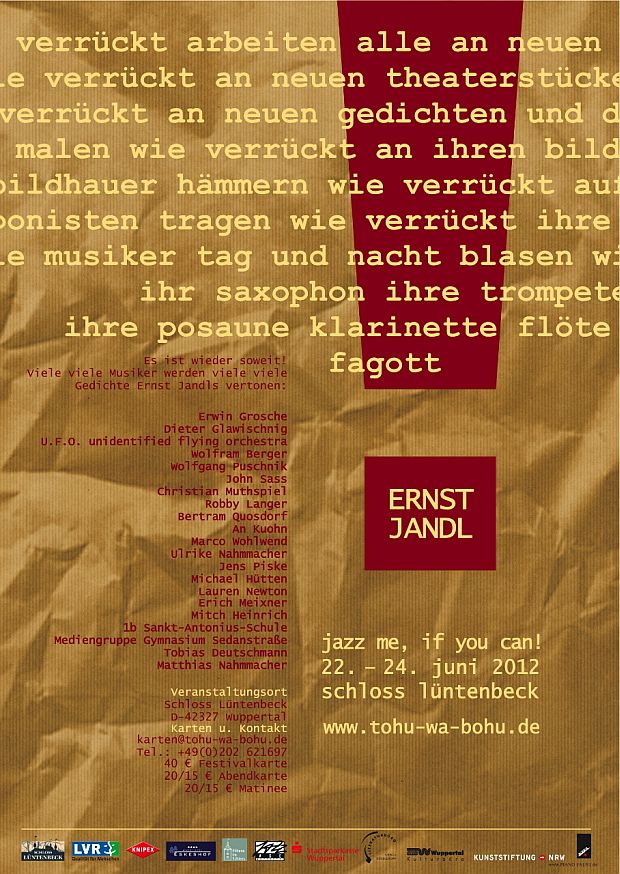 Als wir dieses Plakat für das Ernst-Jandl-Festival eingerückt haben, war dessen Gründer und spiritus rector Matthias Nahmmacher noch unter uns. Vor einer Woche ist Matthias plötzlich und für alle bestürzend gestorben. Seine Frau Ulrike möchte, daß das Fest zu seinem Andenken stattfindet. Merken Sie also den 22.-24. Juni in Ihren Kalendern an und kommen Sie - auch, um von Matthias Nahmmacher Abschied zu nehmen!