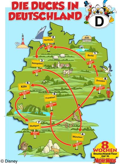 Weiter geht es mit den Etappenzielen: Ruhrgebiet (7.9.), München (14.9.), Frankfurt/M. (21.9.), Köln (28.9.), Stuttgart (5.10.) und über Dresden (12.10.) geht es zurück nach Berlin. Die gesamte Reise, ist unter www.ehapa-shop.de/ddid übrigens auch im Mini-Abo erhältlich und wird auf www.micky-maus.de mit noch mehr Wissenswertem begleitet, unter anderem einem interaktiven Städte- oder Dialektequiz. Auch ein exklusives Reisetagebuch der Ducks wartet auf alle Reisebegeisterten.