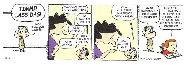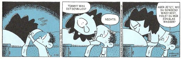 „Der Familienwahnsinn geht in die nächste Runde: Baby Blues 14 läßt gewohnt witzig und skurril in die alltäglichen Familien-Abgründe zwischen Windelbergen und Wäschekörben blicken“ schreibt der Verlag zu diesem erfrischenden neuen Band der Reihe und behält Recht. Alles spielt sich so ab, wie im wirklichen Leben, das die Gags allerdings nicht immer so pointiert verteilen kann wie das Jerry Scott und Rick Kirkman hinbekommen. Mort Walker und Dik Browne haben es ihnen von den 50er Jahren an mit "Hi & Lois" vorgemacht - Scott und Kirkman erweisen sich als würdige Nachfolger.