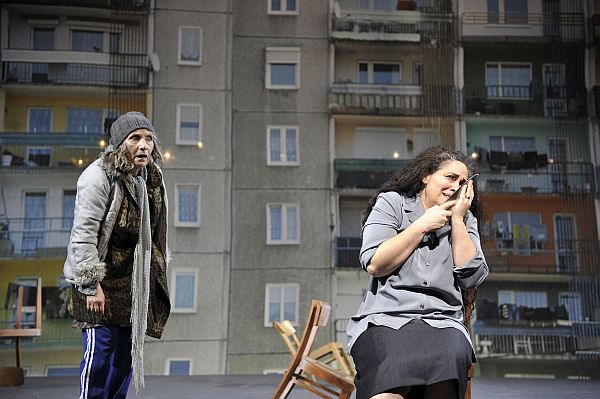 Das Bühnenkonzept und die Inszenierung von Christian von Götz sind schlicht und werkdienlich: das Theater findet nach vorne gezogen auf dem Orchestergraben statt, während das Orchester erhöht auf einem Podium von der Bühne den „Soundtrack“ liefert, was für die wichtige Wortverständlichkeit absolut richtig ist. Hilary Griffiths leistet mit dem Sinfonieorchester Wuppertal wirklich Großes, die Verbindung zwischen Orchester und Darstellern bleiben stets eng ineinander verzahnt, die schwierigen Einsätze zwischen Sprechtheater und Musikdrama werden fließend beachtet, die Ausgewogenheit zwischen Textverständlichkeit und aufwallender Sinfonik hervorragend austariert. Götz inszeniert den Lorca/Fortner schlicht vom Blatt weg und bedient sich dabei der starken Persönlichkeiten der Darsteller. Ein Trennvorhang mit der Fassade einer Hochhaussiedlung und Ulrich Schulz` zeitgenössische Kostüme suggerieren Aktualität, in der lyrisch-symbolischen Flucht- und Todesszene wird alles noch einmal passend reduziert und das Augenmerk ganz auf die