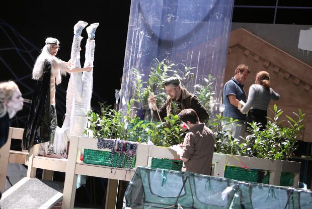 Während ganz rechts auf der Bühne eine Planungsgruppe große Papiere an die Wand kleistert, gibt es in einer Gummibaum- und Palmen-Plantage ein paar gießende Gärtner, zwei Frauen erschöpfen sich als Dauer-Strickerinnen, eine Gruppe junger Mädchen räkelt sich in unterschiedlichsten Gewändern und zwei Tüftler haben eine Art Gewächshaus aufgebaut, durch das verschiedene Mitspieler auf einem Rollbrett hindurchgleiten. Am allerbesten aber ist der Tisch ganz links auf der Bühne, wo zwei schweigsame ältere Herren auf einem Klapptisch Kaffee-Kannen aufgebaut haben und unentwegt Waffeln backen.