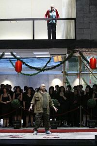 Doch zurück ganz zum Anfang: Was zeigen uns „Skandal-Regisseur" Tillmann Knabe und sein Bühnenbildner Alfred Peter diesmal für eine Welt? Daß es keine Märchen-Idylle im Kostümrausch werden würde, war anscheinend nicht jedem Besucher der Essener Oper klar – aber kann man denn heutzutage, insbesondere im Internetzeitalter – nicht wenigstens eine marginale Vorbereitung beim Publikum voraussetzen? Ich bin immer wieder ratlos, wenn die überwiegende Mehrheit der Opernbesucher anscheinend auch im Jahre 2007 weiterhin der Meinung ist, alles müsse alles so aussehen, als wenn immer noch Otti Schenk, Herbert von Karajan oder Michael Hampe tätig seien. Darüber hinaus sollte sich die Direktion des Aalto Gedanken machen, ob man Personen (netterweise) Zugang zu Generalproben verschafft, die sich anschließend für diese Freundlichkeit dadurch revanchieren, daß sie sich quasi agitatorisch im Vorfeld lauthals negativ äußern und sogar noch vor der Operpremiere mächtig Anti-Stimmung betreiben. Keine Liebesheirat Knabes TURANDOT spielt in einem heutigen gar nicht so fiktiven autoritären Staat, wobei die Maske des tagesaktuellen Chinas zwar nicht mehr so genau paßt, aber durchaus stellenweise kongruente Ansatzpunkte erkennbar macht. Hier wird, wie im Originaltext vorgegeben, geköpft, gefoltert und massakriert – zur Erbauung des Volkes. „Brot und Spiele“ im Kaiserreich unterscheiden sich halt kaum von jenem „panem et circenses“ im alten Rom. Was ist daran so befremdlich? War nicht Turandot auch in schönen 10–meter-langen Samt- und Goldgewändern schon immer eine Serienmörderin? Und was ist so verstörend unverständlich an Knabes Interpretation des Kalaf als einen von Ehrgeiz getrieben Jüngling, der als verstoßener Königssohn schlicht und einfach und um jeden Preis an die Macht kommen möchte, um sein Geschlecht in der Herrscherhierarchie weiterleben zu lassen? Daß er diese furchtbare „eisumgürtete“ Prinzessin nicht wirklich lieben kann
