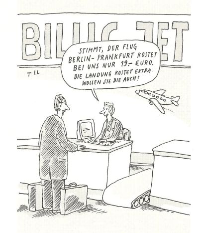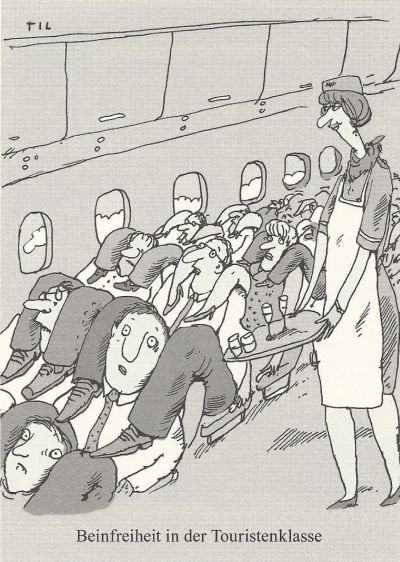 Sind Ihnen eigentlich Flugreisen mittlerweile auch so verleidet? Ich muß nur an die Wartezeiten an Flugschaltern, Personenkontrollen und auf den Startbahnen denken, an die für Pygmäen berechnete Beinfreiheit von Sitzgrößen und –abständen, an die die Grenze zu kulinarischen Verbrechen überschreitenden Gummi-Sandwiches - falls überhaupt noch den Reisenden Nahrung außer winzigen Erdnußtütchen angeboten wird – und an den fetten, schwitzenden Sitznachbarn (möchten Sie z.B. neben Rainer Calmund sitzen?), und zack! habe ich das Frühstück auf. Vom verlorenen oder zerlegten Koffer gar nicht groß zu reden – Til Mette geht es ganz offensichtlich ebenso, was ihn zu einem Befreiungsschlag in aller unser Namen per Cartoon angeregt hat.
