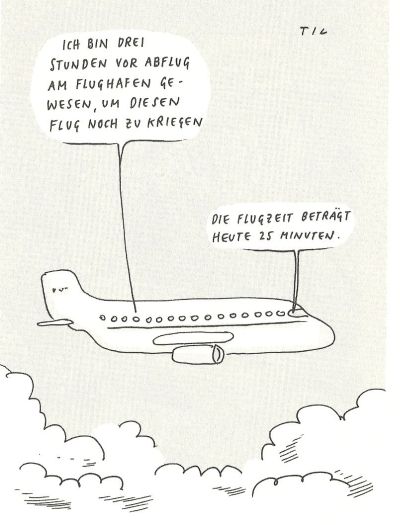 „Guten Fluch!“ heißt das bei Lappan erschienene Bändchen, mit dem er den aussichtslosen Kampf gegen die Unkultur der modernen Flugreisen aufnimmt. Besonders jetzt, kurz vor der Haupt-Reisesaison, in der das Geschäft mit der Fliegerei brummt und sich verdächtig billige Airlines mit Sonderangeboten um die Kunden streiten, die sie dann in ihren Flugzeugen mißhandeln, ist diese Sammlung aufrüttelnder Cartoons unbedingt angebracht und sollte an allen Flughäfen vor dem Eingang feilgeboten werden. Der Titel und die Cartoons sprechen eigentlich für sich. Und doch ist das kundige Vorwort des Flugkapitäns Christoph Seebass eine nette Beigabe – die nicht unbedingt beruhigend wirkt. Gehen Sie also mit Til Mette auf die Reise. Wer weiß, vielleicht nehmen Sie demnächst doch lieber die Bahn. Oder bleiben überhaupt zu Hause.