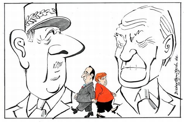 Dabei sind durchaus hervorragende Zeichner am Werk. Auf deutscher Seite etwa Paul Flora (1922-2009) und Friedrich Karl Waechter (1937-2005), auf französischer Jean Effel (1908-1982) und Siné (Maurice Sinet, geb. 1928). Köstlich die das Verhältnis General De Gaule / Bundeskanzler Prof. Erhard charakterisierende Karikatur von Paul Flora, die Erhard als rundlichen Amor ohne Pfeile im Köcher zeigt, während der General sich verächtlich abwendet. “Un amour sans flèche” (18.09.1964). Auf dem Köcher steht: “Konkrete Vorschläge” – daran mangelt es … Alle Textbeiträge im Katalog sind informativ, lehrreich, lesenswert! Schön, daß die Professorin Ursula E. Koch mit ihrem grundlegenden Aufsatz (“Das deutsch-französische Tandem und die Mediatisierung der Geschichte durch die Karikaturisten von 1945 bis heute”) in “ein paar allgemeinen Bemerkungen” auf das Wesen und die Wirkungsmöglichkeit der Karikatur eingeht! Thérèse Willer bringt die Sicht des Elsass auf das französisch-deutsche Duo ins Spiel und würdigt die Zeichner Hansi (1873-1951) und Zislin (1875-1958), die in Deutschland zu wenig bekannt sind. Am Schluß steht die Präsentation der “jungen Garde”, darunter der Belgier Pierre Kroll (geboren 1958), der mit traditioneller Strichführung rundliche Knubbelfiguren aufs Papier zaubert, sogar Angela Merkel als Nackedei, Maßkrüge schleppend. Beachtlich die Portrait-Galerie von Frank Hoppmann (geboren 1975), Arbeiten mit Acryl, Aquarellfarbe, Buntstift, Bleistift oder Tusche auf Papier! Dargestellt sind alle französischen Staatspräsidenten nach De Gaulle und die deutschen Bundeskanzler nach 1945. Hervorragend getroffen, obwohl von Vergänglichkeit stigmatisiert! Gesichter aus tausend Falten, mit tief gefurchten Fleischwülsten und wuchernden Augenbrauen. David Levine (1926-2009), der große amerikanische Karikaturist, mag ein Vorbild gewesen sein, aber die Spuren des Verfalls, die Hoppmann schonungslos mit seiner Portrait-Galerie hinterläßt, sind ein neues “Markenzeichen”. Ein kleiner Tadel zum Schluß! Man sollte “couple” nicht mit “Tandem” übersetzen. Unwillkürlich sieht man das geneigte Gesicht des Mitfahrers in der Nähe des Hinterteils seines Vordermannes … Ein Anblick von hohem Reiz – für Karikaturisten! Straßburg ist immer eine Reise wert. Diese Ausstellung (bis zum 14. Juli, na klar!, Anm.d.Red.) ist eine zusätzliche Attraktion. Wer sich – wie ich! – die Reise versagen muß, kann sich oft und lange an dem schönen Katalog erfreuen: Vom Duell zum Duett  Satirische Seitenblicke auf das deutsch-französische Paar von 1870 bis heute  Éditions des Musées de la Ville de Strasbourg  Mit Beiträgen von Alexandre Devaux, Franck Knoery, Ursula Koch und Thérèse Willer  Zweisprachige Ausgabe (Französisch und Deutsch)  192 Seiten, etwa 200 Illustrationen - ISBN : 9782351251027  Preis: 39,– Euro Die ausgestellten Künstler