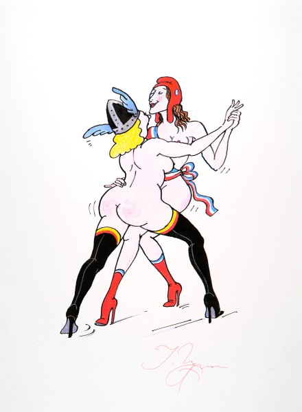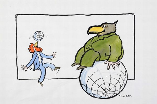 Anders oft in Zeiten revanchelüsterner Kriegspolitik – hier mag man manchmal fragen, ob sich die Karikatur nicht instrumentalisieren läßt, um Ängste und Haßgefühle zu schüren. Auf der Woge aggressiver Zeitströmungen setzen sich auch Künstler nicht selten an die “Spitze der Bewegung”. Bemerkenswert in diesem Zusammenhang der Einsatz wirkungsvoller Symbole und Embleme! Pickelhaube und Stahlhelm stehen für Preußen und Deutschland, die Jakobinermütze mit Revolutionskokarde ziert die französische Marianne, die der fülligen, aber auch bei spärlicher Kleidung stets wehrhaften Germania entgegentritt. Der gallische Hahn kräht unerschrocken unter dem finsteren Blick des riesigen und gefährlichen deutschen Adlers.  Gerade jetzt erleben wir bei einigen europäischen Nationen, wie wenige Merkmale genügen, um ein Feindbild auferstehen zu lassen, etwa das Hitler-Bärtchen und das Hakenkreuz                                        Bis in die Gegenwart werden bestimmte Accessoires immer wieder zur Kennzeichnung benutzt, auch bei Tomi Ungerer, der einen unbefangenen Zugriff hat und sie spielerisch einsetzt. An Tomi Ungerer läßt sich auch zeigen, wie unverkrampft Gegenwartskünstler mit dem französisch-deutschen Verhältnis umgehen, ohne allerdings wichtige Unterschiede der Wesensart beider Völker zu vertuschen. Der gallische Hahn jongliert elegant mit einer kleinen Weltkugel, der beleibte deutsche Adler sitzt träge und behäbig auf einem mächtigen Globus. Wo der Franzose zur Frivolität neigt, läßt der Deutsche langweiligen Bierernst erkennen. Natürlich ist es schwierig für einen Karikaturisten, in Zeiten freundschaftlicher Zusammenarbeit zwischen zwei Völkern lohnende Themen zu finden und sie aufzuspießen. Kleine Divergenzen und Differenzen zwischen den Regierungen werden aufgegriffen und mit liebenswürdigem Spott bedacht, Irritationen der Partner glossiert.