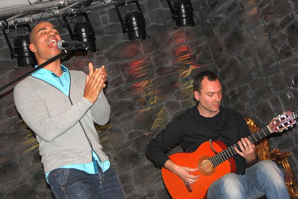 Sascha Blejwas und Marvin Becker, Profis von echtem Schrot und Korn, sind nicht zuletzt auch durch ihre jahrelange Zusammenarbeit in der Band „Soulcookin“ ein gut eingespieltes Duo. Das bewiesen sie auch am Freitagabend vor ganz kleiner Kulisse in der intimen Atmosphäre des erlesenen Elberfelder Theatercafés „Kontakthof“. Die Kombination von Marvin Beckers über viele Oktaven tragender rarer Jazz-Stimme und der von Sascha Blejwas gefühlvoll gespielten akustischen Gitarre läßt im Grunde keinen weiteren Sideman vermissen. Sensibel im Timing serviert das Duo BéBé eine geschmackvolle Mischung aus Jazz, Soul, Pop und Balladen, bei einer Bandbreite von Gershwins „Summertime“ und Joseph Kosmas Standard „Autumn Leaves/Les feuilles mortes“ über Otis Reddings „Sad Song (Fa-Fa-Fa-Fa-Fa-Fa-Fa-Fa-Fa)“ bis „Kiss“ von Prince.