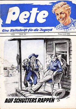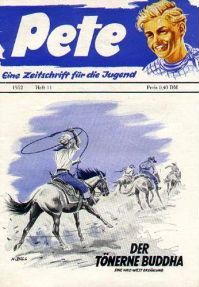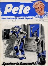 Von 1951-1959 sind über 200 Pete-Hefte erschienen, mit humorig-aufregenden Titeln wie: DAS UNGEHEUER VON SOMERSET - PETE GRÜNDET EIN PARADIES - JIMMY FÄNGT KLAPPERSCHLANGEN - ES TUT SICH WAS IN DER BLADMORE-SCHLUCHT - BIS DIE SCHWARTE KNACKT - DER VERHINDERTE WELTUNTERGANG - DIE BALLADE VOM FALSCHEN SHERIFF - MIRANDUS, DER TEUFELSBOCK- WER SPIELT HIER DIE ERSTE GEIGE? In die Jahre gekommen war Pete auch nicht mehr durch das bis heute übliche Cover-Relaunch zu retten (Petes Bild wurde in die linke Ecke versetzt, er bekam ein rotes Halstuch verpaßt, die Dominanzfarbe Blau des Umschlags wurde ersetzt durch kreischende Buntheit), und so hauchte Pete sein Leben aus, in der Blüte seiner Jahre, verschwand ins Pantheon ewiger Jugend.