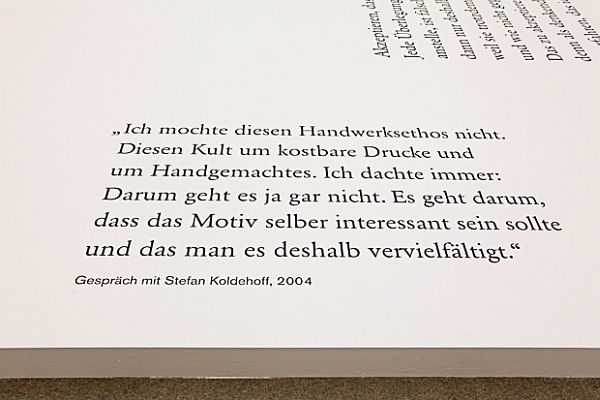 Richter selbst kommt in der Ausstellung mit einigen Zitaten zu Wort, die sein Verhältnis zu Auflagen-Kunst verständlich machen. „Ich mochte dieses Handwerks-Ethos nicht, diesen Kult um kostbare Drucke und Handgemachtes. Es geht darum, daß das Motiv interessant sein sollte und das man es deshalb vervielfältigt“, sagte er etwa 2004. Noch früher, als seine Editionen nicht auch schon Riesensummen kosteten, meinte er, er sehe sie „als einen willkommenen Ausgleich für die Produktionen von Gemälden, die Unikate sind.“