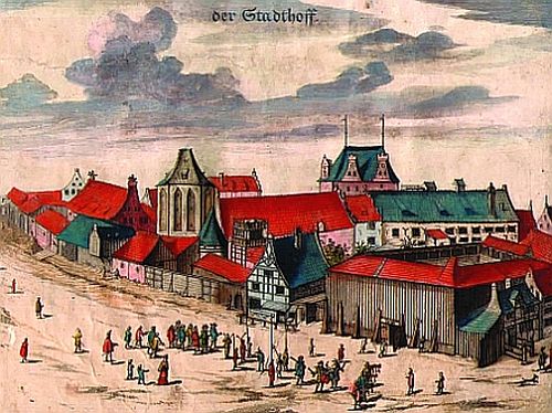 So wurden noch zu seinen Lebzeiten William Shakespeares Stücke in Danzig aufgeführt, daneben Meisterwerke von Christopher Marlowe, Thomas Dekker, George Chapmann oder Thomas Middleton und anderen. Nach den ersten Gastspielen dieser Schauspielertruppen wurde ein festes Theater gebaut, bekannt als die „Fechtschule“. Obwohl eigentlich ein Mehrzweckgebäude, wurde es das erste öffentliche Theater in ganz Polen, das dem Londoner „Fortune Playhouse“ auffallend ähnelte. Dieses Danziger Theater, 1611 erstmals urkundlich erwähnt, blieb über gut 100 Jahre hinweg das einzige, ständige Theater der Stadt. Als Holzbau erlebte es zahlreiche Renovierungen und Umbauten. 1635 wurde es abermals neu errichtet. In dieser Form, entworfen von dem holländischen Architekten Jakob van Blocke, ist es auf einem Stich des Niederländers Peter Willer von etwa 1650 zu sehen.