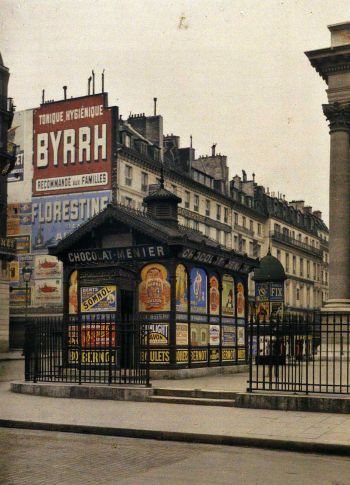 Überraschendes Material aus der Frühzeit der Farbfotografie haben nun der prominente Fotohistoriker und -theoretiker Rolf Sachsse und seine Co-Kuratoren zu einer eindrucksvollen Schau zusammengestellt, die Einblicke in eine Welt gewährt, die uns fern und nah zugleich ist. Fern, wo uns längst verstorbene Menschen aus fremden Ländern in Kleidern anschauen, die heute nur noch bei Folkloreabenden getragen werden, nah, wo Orte abgelichtet wurden, die dem Betrachter seinerzeit zwar als fremdartig erscheinen mußten, die mittlerweile aber zum Standardprogramm des modernen Massentourismus gehören – von der Cheopspyramide im ägyptischen Gizeh über die Sülemaniye-Moschee in Istanbul bis zum Taj Mahal im indischen Agra. Interessanter als die Aufnahmen dieser bedeutenden Monumente der Menschheitsgeschichte ist zum Beispiel ein Farbfoto der Place de la Bourse in Paris vom 5. Juni 1914 (oben). Denn es zeigt den menschenleeren Platz so, wie wir ihn nie mehr sehen werden, nämlich zeittypisch mit großflächiger Fassadenreklame und grellbunter Plakatwerbung, die das Konsumangebot der Franzosen vor hundert Jahren dokumentiert. Von der nahenden „Urkatastrophe“ des 20. Jahrhunderts ist auf diesem nicht einmal zwei Monate vor Kriegsbeginn aufgenommenen Foto nichts zu erahnen.