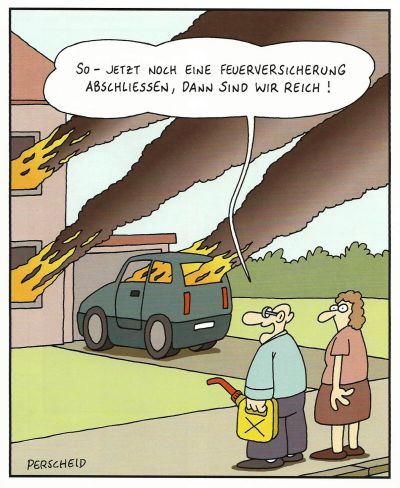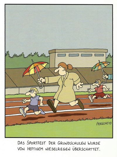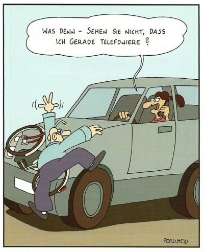 Nun ist sein neues Buch da: „Ich würde Sie ja anzeigen, aber ich seh´nix!“, dessen Titelcartoon das ganze Dilemma verfehlter männlicher Selbsteinschätzung auf den Punkt bringt. 187 Cartoons versammelt der für jedermann leicht erschwingliche Band. Beim Ladenpreis von 9,95 € macht das 5,32 Cent pro Bildchen, und das ist es nun wirklich allemal wert. Natürlich haben wir über eine kleine Bildauswahl beraten, die Ihnen Perscheids ausgewogene, wenn auch nicht immer für Dummbeutel verständliche und pubertierende Rotzlöffel verständliche Sozialkritik nahe bringen kann – und sind uns darüber heillos in die Haare geraten. Kein Wunder bei wie gesagt 187 (mit Titel- und Rückseite sogar 189) Möglichkeiten, ihn oder sie, Dich oder mich in die Pfanne zu hauen. Denn hier kommt in gewohnter Manier keine(r) ungeschoren davon. Perscheid greift aktuelle politische Diskussionen ebenso auf wie Schiffsuntergänge, Umweltprobleme und Fernsehgewohnheiten, Kino, Kommunikationstechnik, Straßen- und anderen Verkehr. Schließlich haben wir uns doch auf fünf Beispiele geeinigt. Die zeigen wir ihnen hier und jetzt – unkommentiert.