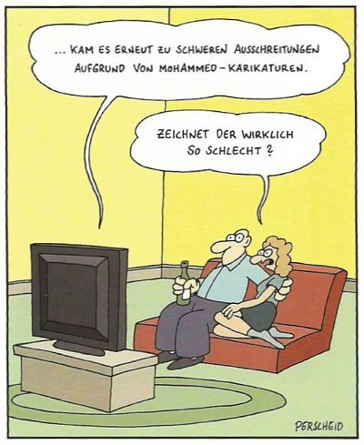 Wir lieben Martin Perscheid. Wir Männer in der Redaktion lieben ihn wegen seiner unerhört klarsichtigen Cartoons über Frauen, ihre Logik und ihre unvergleichlichen Fahrkünste. Die weibliche Belegschaft schätzt ihn wegen seiner unerhört klarsichtigen Cartoons über Männer, ihre Logik und überragende Intelligenz. Und alle lieben ihn wegen seiner außergewöhnlich sensiblen political correctness. Perscheid ist nicht nur zum unverzichtbaren Bestandteil der Lachkultur im deutschsprachigen Raum geworden, er ist moralische Instanz, lehrt uns, Minderheiten zu respektieren, setzt erotische wie politische Maßstäbe, legt den Finger – oder sollte man sagen: Zeichenstift – in schwärende gesellschaftliche Wunden und ist einfach als Cartoonist eine unvergleichliche Rampensau. Eigentlich Zeit, ihn auch mal zu exportieren, Perscheid würde, vielleicht abgesehen von einem gewissen Teil der 1,5 Milliarden Muselmännern und -frauen, aber die haben ja qua Religion ohnehin keinen Humor - weltumspannend verstanden und geschätzt werden.