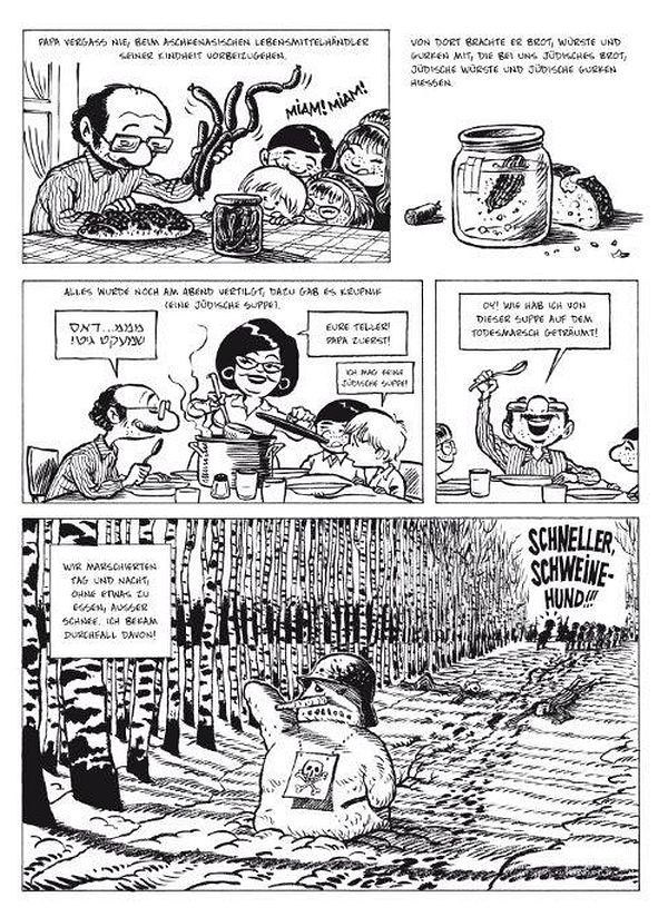 Noch mit 70 Jahren begleitet Michels Vater dreimal jährlich Besuchergruppen von Brüssel nach Auschwitz. Ein Museum der Deportation in Vielsalm ist nach dem Vater benannt und er schrieb sogar ein Buch über seine Erlebnisse im Lager. „Die Gläubigen in den Lagern, die zu Gott gefleht haben, haben mich geärgert. Denn wenn es Gott gäbe, dann hätte es die Lager nie gegeben“, sagt der alte Mann in der Graphic Novel. Und ganz am Ende, umgeben von seinen Enkeln in Israel, erzählt der Vater sogar selbst Shoah-Witze. Für den Autor Michel Kichka ist es eine lebenslange Aufgabe geworden, sich mit der Biographie seines Vaters und mit dem durch die Shoah verursachten Trauma seiner Eltern auseinanderzusetzen.