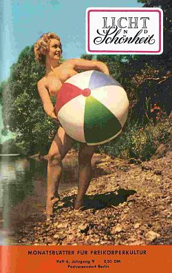 Erstaunlich viele FKK-Periodika hat es in den 50er/60er Jahren gegeben, wie der Anhang dazu nachweist: „Sonnenfreunde“, „Unser Leben“, „Eos“, „Helios“, „Sonnenstrahl“, „Der Naturist“ (nocht: Die Naturistin, Anm.d.Red.), „Humana“, „Olymp“, „Mensch und Narur“, „Sonnenfreunde“ und nicht zu vergessen „Licht und Schönheit“ als kurzer Auszug aus der weit umfangreicheren Literaturliste. Zwei der hübschen Titel haben wir zur Illustration dem Buch entnommen. Da muß sich ein Autor redlich durchkämpfen, will er alle Aspekte beachten und erwähnen. Da hat sich Ernst Horst gewiß ebenso viel Arbeit gemacht, wie der oben erwähnte Richter. Doch wird er neben dem publizistisch ehrenwerten Unterfangen dabei wohl mehr gekichert haben als geschwitzt. Das liest sich kundig,