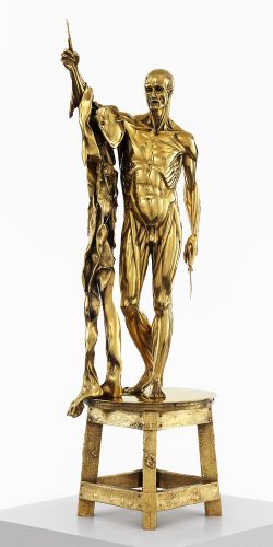 Dies belegen etwa zwei antike Darstellungen des Satyrn Marsyas, der es gewagt hatte, Apoll zu einem musikalischen Wettkampf herauszufordern, in dem er unterlag und zur Strafe gehäutet wurde. Von Marsyas schlägt die Kuratorin einen großen Bogen zur Kunst der Gegenwart, nämlich zu Damien Hirsts vergoldeter Skulptur „Saint Bartholomew“ von 2011, die den Heiligen als Märtyrer vorstellt, der seine Haut, die ihm von seinen Folterern abgezogen wurde, über den scheinbar triumphal ausgestreckten Arm geworfen hat. Hirst zitiert hier den berühmten „Muskelmann“ mit seiner anatomisch genauen Wiedergabe der menschlichen Muskelgruppen, den der klassizistische französischen Bildhauer Jean-Antoine Houdon im Jahr 1767 geschaffen hatte. Diese Strategie der Appropriation, der Aneignung und verfremdenden Verarbeitung vorhandenen Materials ist ein typisches Merkmal postmoderner Kunstpraxis, die seit geraumer Zeit unter dem Begriff der „Appropriation Art“ zirkuliert. Im Unterschied zur Hirst „Bartholomew“ erscheint die 2007/08 entstandene wächserne „Pietà“ der belgischen Bildhauerin Berlinde De Bruyckere künstlerisch wesentlich eigenständiger, auch wenn sie ein ikonographisch traditionsreiches und kunstgeschichtlich stark besetztes Thema aufgreift. Ihre eindringliche Wirkung bezieht diese Skulptur aus der irrtierenden Tatsache, daß sie nicht nur kopflos ist, sondern auch daraus, daß die traditionell den leblosen Christus auf dem Schoß haltende Schmerzensmutter fehlt.