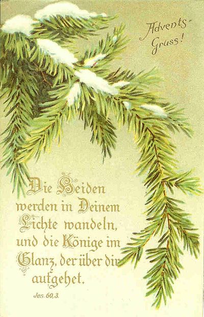 Das Zitat aus dem alttestamentarischen Buch des Propheten Jesaja, Kapitel 60, ist zwar als Epistel dem Tage Epiphanias zugeschrieben (das wäre der 6. Januar, auch Dreikönigstag genannt), aber dem Gestalter dieser etwa 120 Jahre alten Postkarte schien es ganz gut zur Adventszeit zu passen.