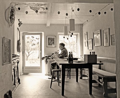 Die Fotografien im Buch zeigen Jorn als nachdenklichen, wenn auch humorvollen Mann in ständiger emsiger Tätigkeit. Ganz vorne aber, auf Seite 9 sehen wir ihn im Jahr 1965, acht Jahre vor seinem Tod, auf einem Foto von Ulrik Ross im Haus seines Freundes Erik Nyholm in Funder bei Silkeborg, tief in sich gekehrt beim Trompetenspiel.