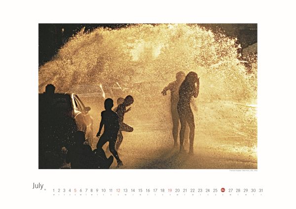 Thomas Hoepkers (*1936) Fotos haben über die Jahrzehnte nicht nur Geschichte dokumentiert. Einige Aufnahmen des Magnum-Fotografen sind legendär und selber Geschichte geworden. Dreizehn Bilder im Querformat 42 x 27,7 cm haben historische Momente und menschliche Situationen für die Ewigkeit eingefroren. Die anachronistische japanische Geisha auf dem Titelblatt läßt ob ihrer persönlichkeitslosen Erstarrung frösteln, die beiden Marines auf dem April-Blatt (eines der besten der unendlich vielen brillanten Fotos Hoepkers) lösen in ihrer gedemütigten, dem unmenschlichen Drill völlig ausgelieferten Situation ebenso Angst und Ratlosigkeit aus wie das September-Bild, das Ausflügler zeigt, die von Brooklyn aus entspannt die brennenden Türme des World Trade Center nach dem Tausende Tote fordernden Anschlag vom 11. September 2001 beobachten. Spielende Kinder im Schatten und auf der Krone der Berliner Mauer 1963, eine Geisterstadt in Mississippi/USA im Jahr 1963, aber auch die Friedlichkeit der Straßenszene eines alten Chinesen mit seinem Singvogel in Peking/China 1984 fesseln den Blick. Berühmt auch Hoepkers Foto der Kinder, die sib in der Juli-Glut von New York im Wasserschwall eines geöffneten Hydranten erfrischen (unten) oder auch das des besten Boxers aller Zeiten, Muhammed Ali 1966, als er noch Cassius Clay hieß, auf dem Dach eines Chicagoer Hauses. Man erlebt lebendige Geschichte. Ein ganz besonderer Kalender.