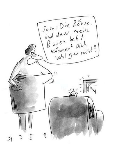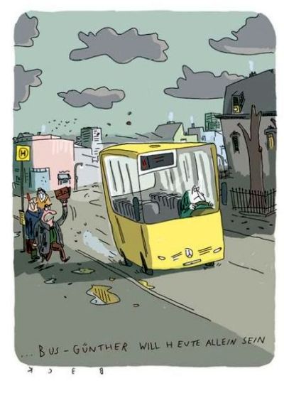 BECK greift das allzu Menschliche auf, wagt sich aber mit reduziertem, scharfen Strich auch an Tabu-Themen, denken wir an Oralverkehr, bombenlegende Muselmanen, den GröFaZ und die Abrechnung mit Mode, Schlankheitswahn und der Kirche. Auch die belebte Natur ist ihm nah, wie der augenzwinkernde Seitenhieb gegen den genialen Kollegen Gary Larson zeigt. Und BECK denkt abseits der Tagesaktualität, die er über seine unten aufgeführte Webseite stets auf dem Laufenden hält, auch ein bißchen weiter. Ob der heute allein bleiben wollende Bus-Günther gar ein wenig von ihm hat? Sogar das Ende, so unwiderruflich wie es ist und kommen wird, dient dem Pragmatiker zu einem schlagfertigen graphischen Aperçu. Da verliert der Tod doch gleich ein ganz klein wenig von seinem Schrecken, gell? Und weil es eben das Ende ist, haben wir einen passenden Cartoon folgerichtig auch ganz ans Ende gestellt.