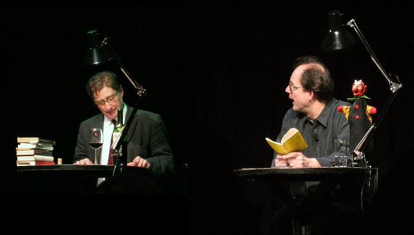 Auf der Bühne des Remscheider Teo Otto Theaters zwei schlichte quadratische Tische mit Leselampe, zwei Stühle, auf dem linken Tisch ein Stapel Bücher, eine Flasche Rotwein, ein Glas, auf dem rechten ein gelbes Reclam-Heft, eine Flasche Wasser, ein Glas. Auftritt des Personals. Links, also beim Rotwein und dem Bücherstapel, nimmt ein korrekt gescheitelter, distinguierter Anzugträger Platz (er wird der Flasche ordentlich zusetzen), Typ Literaturwissenschaftler (Lehre), rechts ein eher leger gekleideter Herr, mehr der Typ Künstler (Schauspieler), wogegen allerdings das Mineralwasser spricht. Es geht um Goethes Opus magnum, den „Faust – Der Tragödie 1. Teil“.