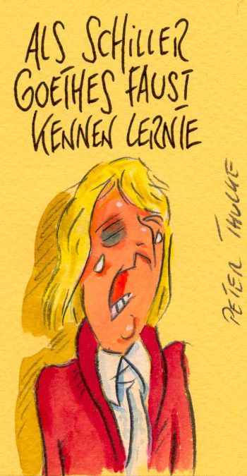 Zum Nachhangeln auch für die Schülerinnen und Schüler des Deutsch-Leistungskurses der Sophie-Scholl-Gesamtschule hier der Vers-Faden, an dem sich dieser ebenso kurzweilige wie lehrreiche Abend entwickelte: 386-701-1064-1147-1334-1350-1359-1546-2465-2605-2897-3306-4405. Aber eigentlich zählten nur die ersten 30 Zeilen des Stücks, meint der Kommentator, später wiederhole sich ja alles nur. Und er legt spitzfindig „Beweise“ dafür vor. Wohl selten wurde eine Literaturvorlesung mit solchen Ovationen gefeiert wie diese. Als Dank gab es eine Zugabe (Mosetter: „Sie haben sich das selbst zuzuschreiben“): „Faust - Der Tragödie 2. Teil“. Na ja, beinahe. Ein köstlicher Abend. Ein „Faust“, der im Gedächtnis bleibt. „Ein Kranker, der in der Fieberhitze phantasiert, schwätzt lange nicht so albern als unser oder vielmehr der Göthische Faust. Von dem Unedlen der Diktion, von der Erbärmlichkeit der Versifikation werde ich in der Folge schweigen; an dem, was der Leser sah, hat er Beweise genug, daß der Herr Verfasser in Beziehung auf den Versbau sich auch nicht mit den mittelmäßigen Dichtern der alten Schule messen könne.“