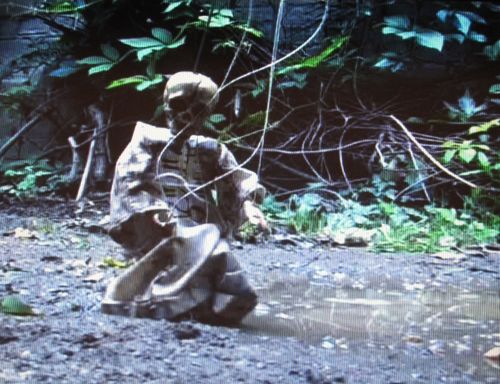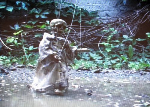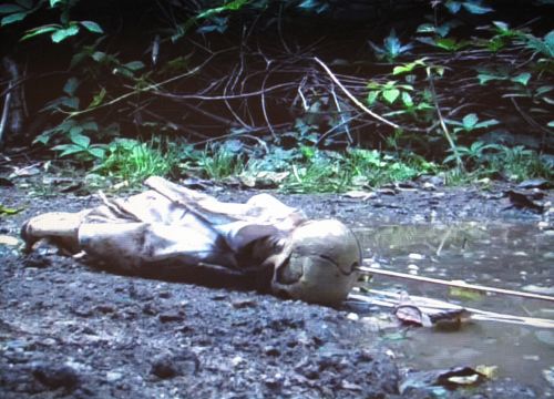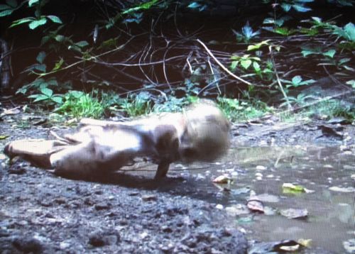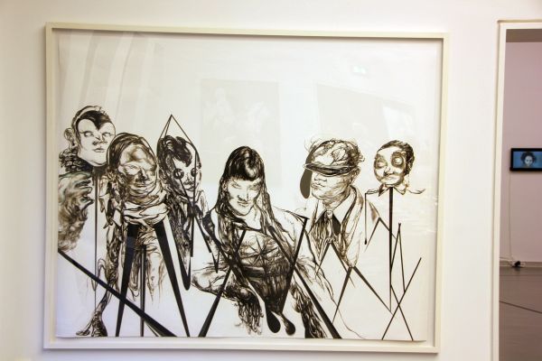 Von Schnittlinien weitergeführt passiert man einen Saal eindrucksvoll aufgereihter Porträts, wiederum an der Stirnseite beherrscht von großformatigen Zeichnungen, darunter „Die Auszeichnung“, bei der Assoziationen zu Grosz, Dix, Hegenbarth und Kubin aufkommen. Über der Blicklinie hängt in tiefer Versunkenheit die Fotoarbeit „Hallucination 6“ und in der Mitte der Fensterfront zur Linken sorgt in einem Guckkasten die Video-Installation „The Archived Death“ für das oben erwähnte Glucksen. Hier nämlich ist es Freund Hein, der vom Menschen an Fäden geführt mal um mal erlebt, wie blöd es ist, auf die Fresse zu fallen – und das noch in einer schlammigen Pfütze. Beinahe tut einem der Gevatter leid.