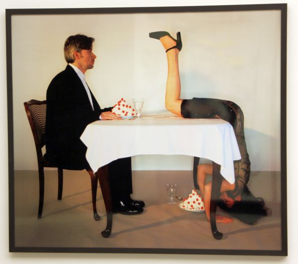 Eine kleine Überraschung erwartet den regelmäßigen Besucher der Kunsthallen-Ausstellungen nach der nächsten Ecke: die wunderbare großformatige Fotografie „Insomnia 3 – Le dîner“ aus dem Jahr 2004 war hier schon einmal zu sehen, als 2012 Werke aus der Sammlung Mairet ausgestellt wurden. Die brillant arrangierte groteske Tisch-Situation wurde für die aktuelle Ausstellung übrigens von einer Wuppertaler Sammlerin und Mäzenin zur Verfügung gestellt. Man möge mir verzeihen, wenn auch hier neben Videos wieder Fotografien mein Hauptaugenmerk gilt, wo doch im Grunde Zeichnungen überwiegen. Doch darf schräg gegenüber „Das Bad“ aus dem Jahr 1999 nicht unerwähnt bleiben. In Analogie zu Ingres und David tut sich ein weiteres Mysterium der Freess´schen Weltsicht auf.